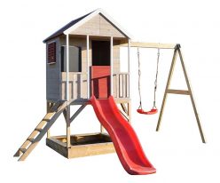 Casetta per bambini da giardino a cui si aggiungono le funzioni di una cucina e di un registratore di cassa.