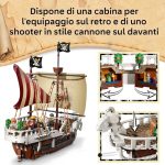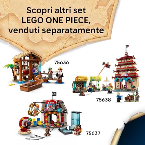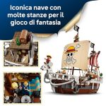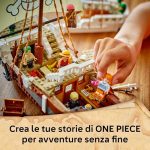 Questo grande galeone LEGO è dotato di alberi, vele, polena e timone; al suo interno si trovano la cabina per l’equipaggio, una cucina, un magazzino, un’officina e 4 poster “Ricercato” Giochi da pirati creativi: Luffy può prendere il suo posto sulla polena a forma di pecora (al di sotto della quale si trova uno shooter in stile cannone per respingere i nemici), mentre Zoro si allena sul ponte e Nami controlla il timone Regalo con nave pirata LEGO: questo set da gioco e da esposizione è un ottimo regalo per i fan degli anime, per gli amanti delle navi giocattolo costruibili, e per gli appassionati della serie live action di Netflix ONE PIECE Guida alla costruzione in 3D: i bambini possono scaricare l’app LEGO Builder per divertirsi con la costruzione del modello, utilizzando strumenti digitali per ingrandire e ruotare il modellino, per salvare i set e monitorare i progressi